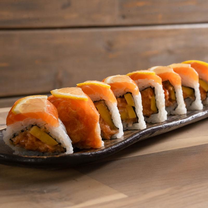 Seared salmon on top of spicy salmon roll with house spicy mayo.
