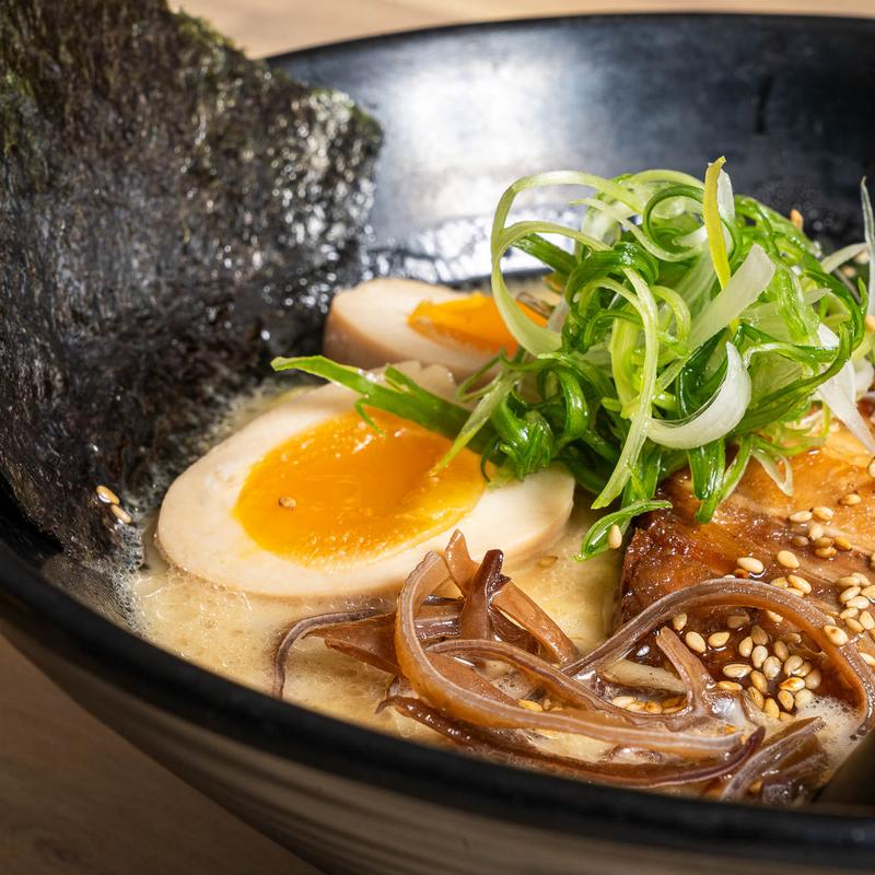 House recipe pork broth, egg noodles, kikurage, green onion, half-boiled egg, chashu, and sesame seeds.