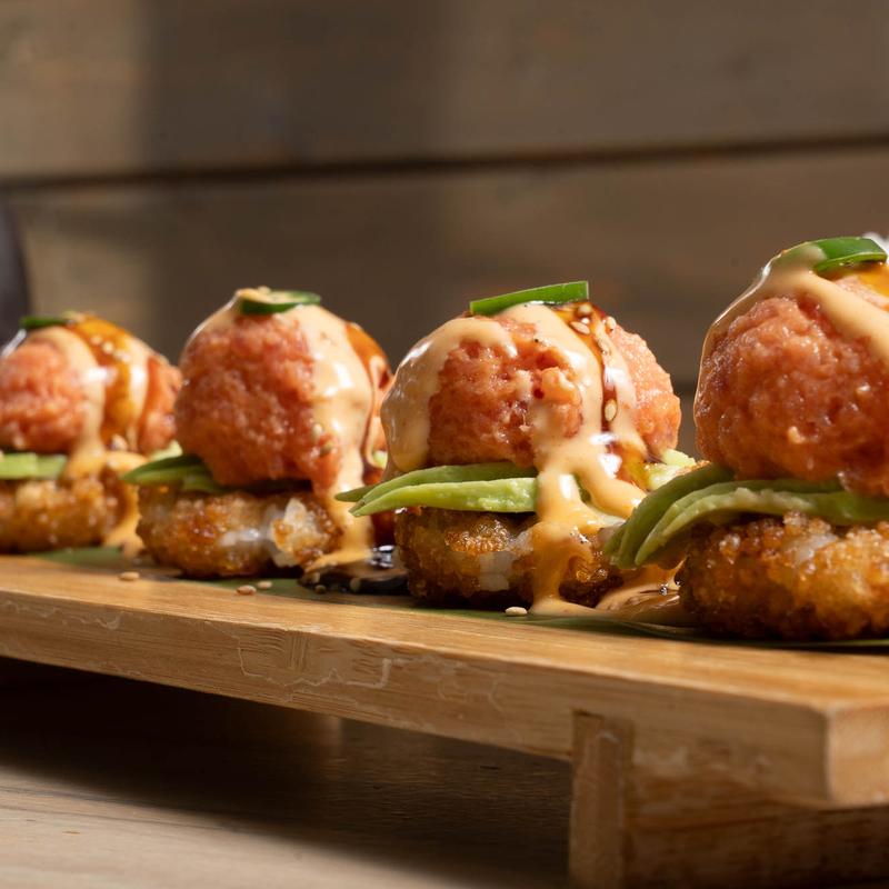 Spicy tuna on top of crispy rice cake.