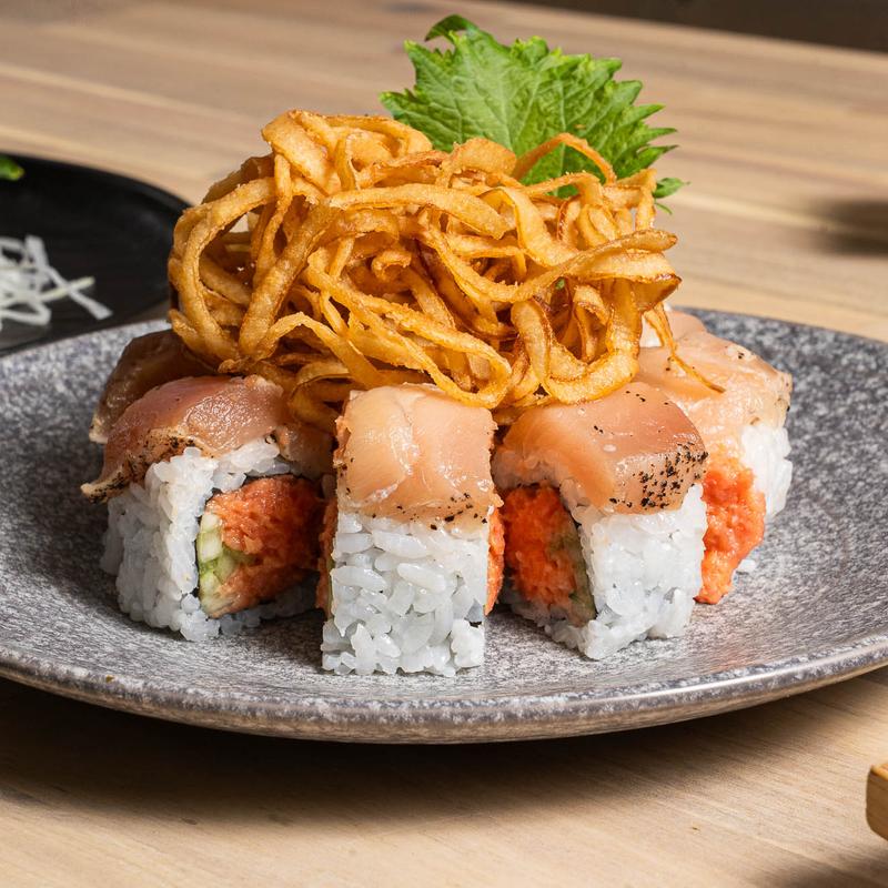 Albacore tuna and fried onion on top of spicy tuna roll with house ponzu sauce.